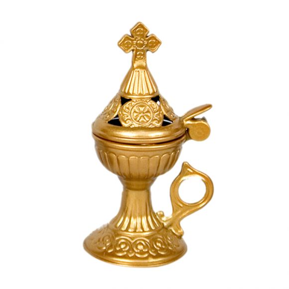 Βυζαντινό Λιβανιστήρι Θυμιατό σε χρυσό χρώμα, κατασκευασμένο από ανθεκτικό ζάμα αλουμινίου. Ιδανικό για εύκολο και άνετο λιβάνισμα του σπιτιού, φιλοτεχνημένο σύμφωνα με την Ορθόδοξη Χριστιανική Παράδοση.